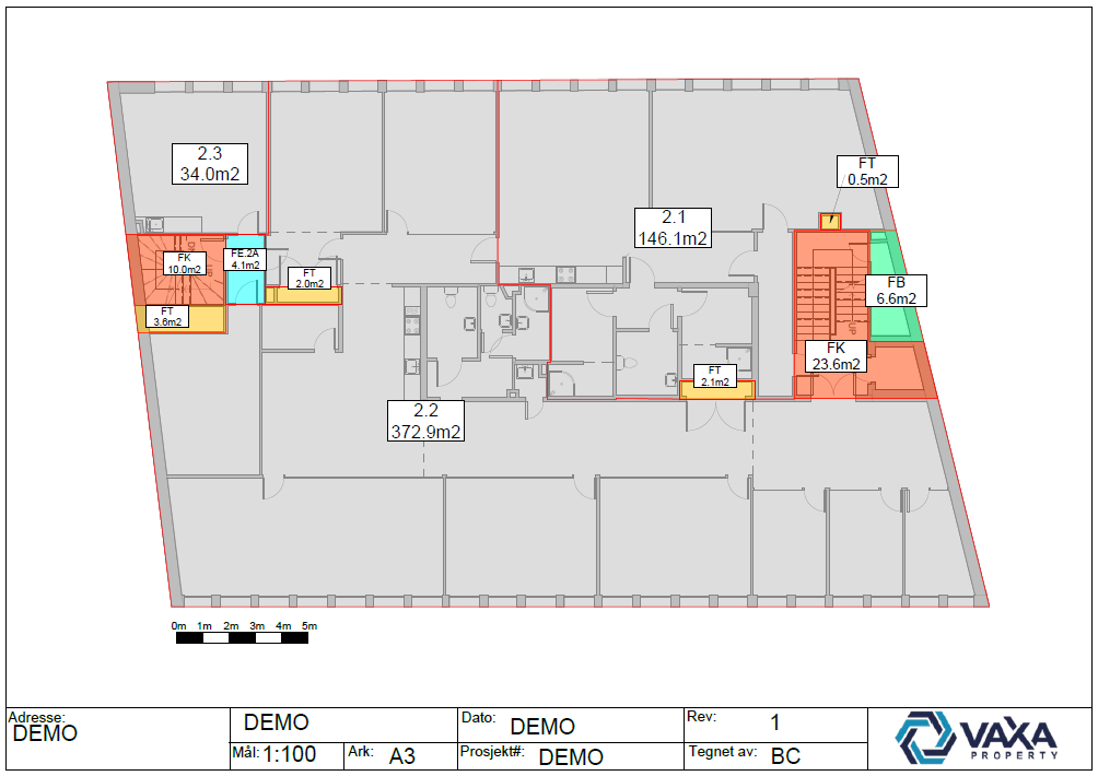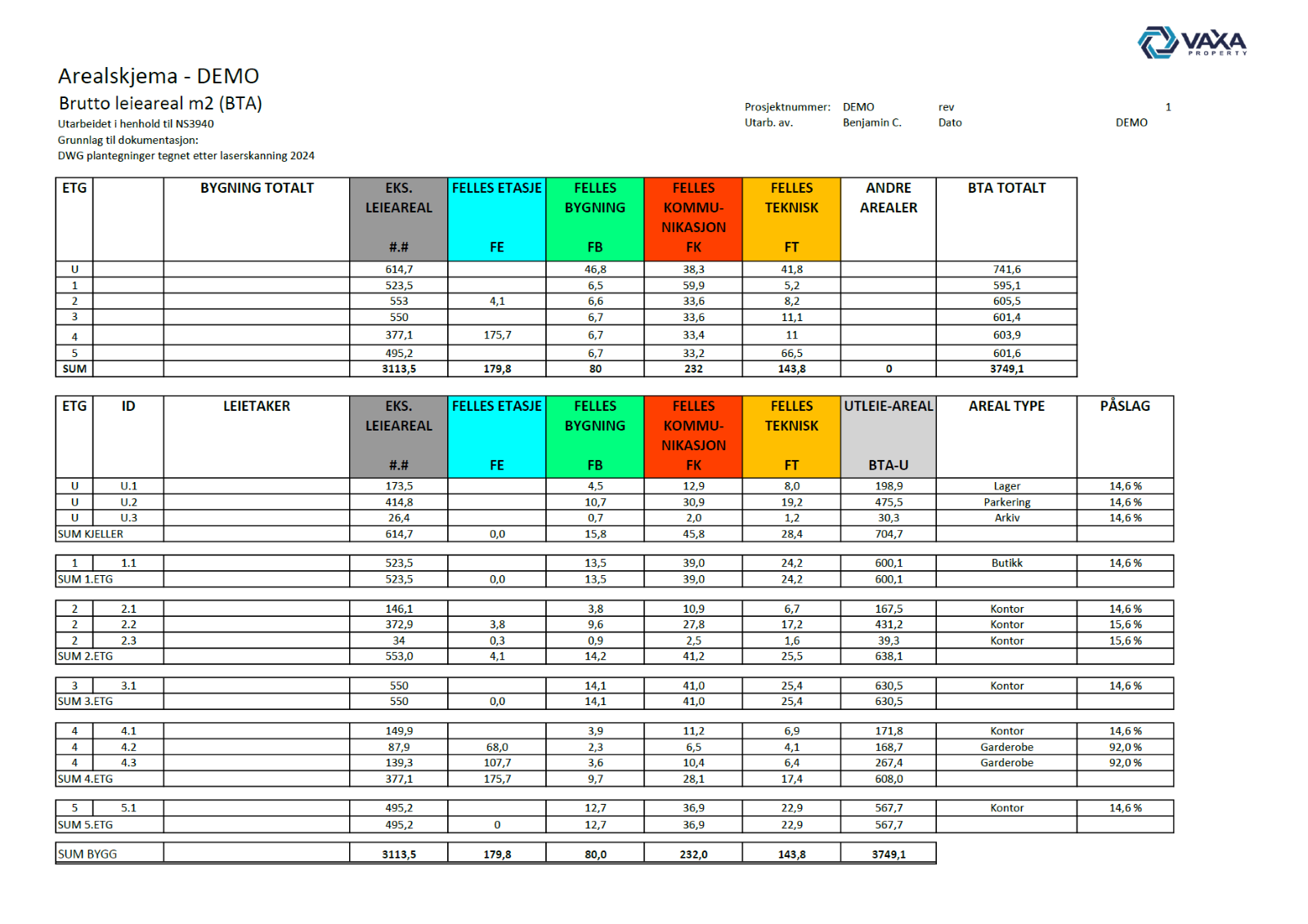 Et arealskjema følger med arealtegningene og viser hvor mye areal enkelte leietakere bruker, inkludert andelen av fellesarealer.