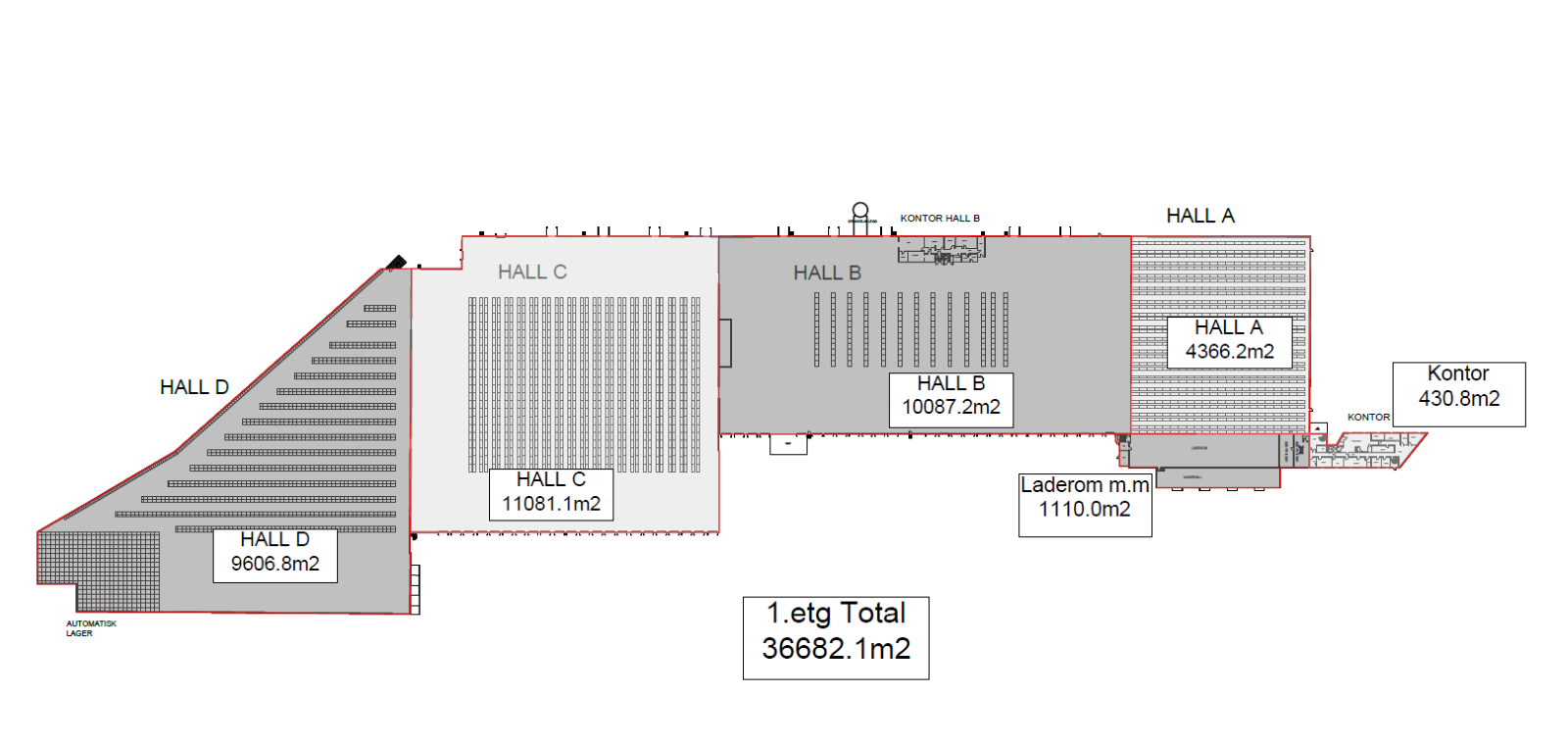 Vi skannet et 40.000 m² kombinasjonsbygg med lagerhaller og kontor ved bruk av en mobile-mapping laserskanner. Hele bygget ble skannet på kun 5 timer, noe som ville tatt flere dager med en tradisjonell stasjonær skanner. Etterpå ble dataene og punktskyene prosessert for å tegne plantegninger, som så ble brukt til å lage arealtegninger og beregne arealer.